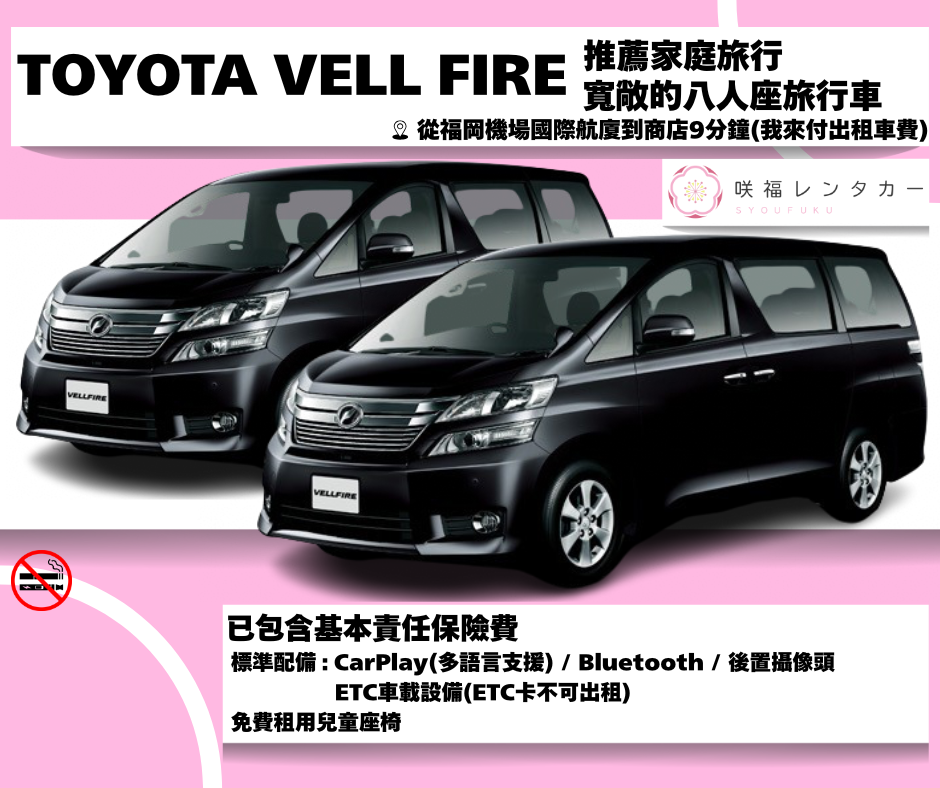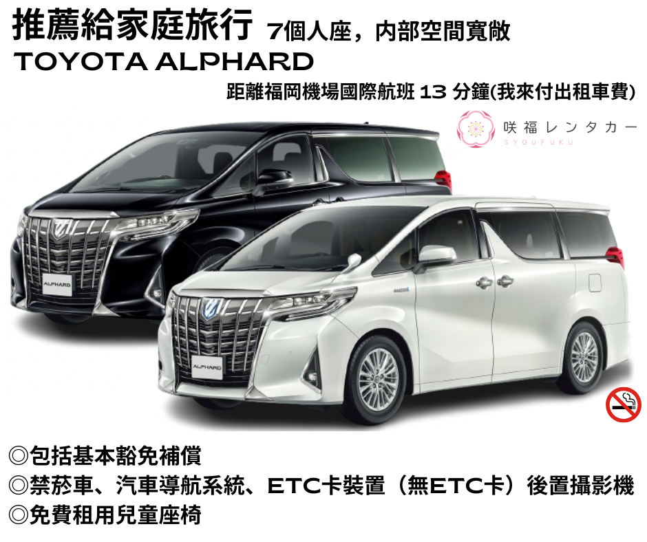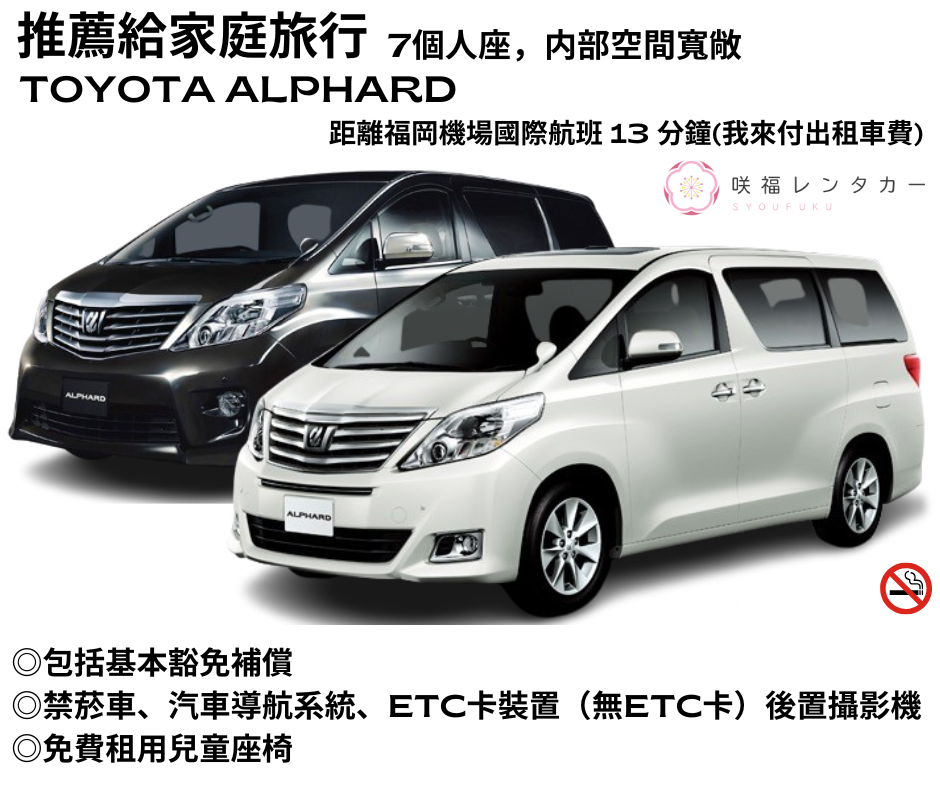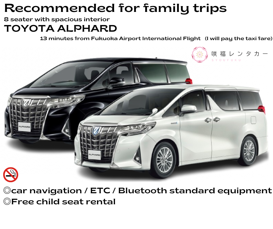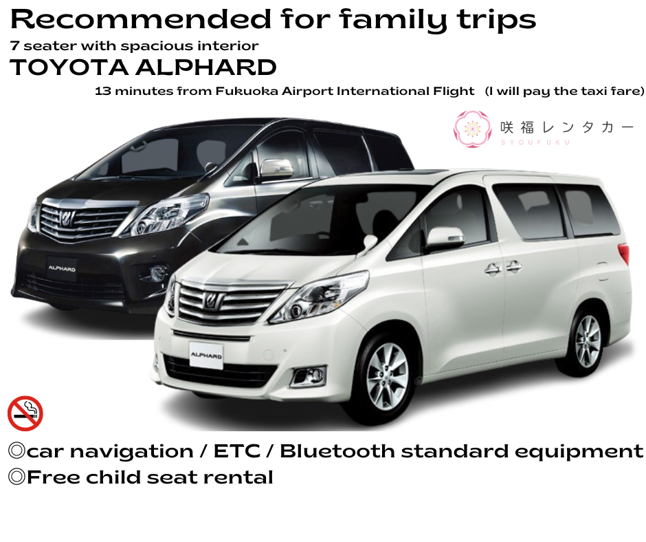 [Spacious TOYOTA ALPHARD 7-seater] ■ Non-smoking ■ GPS / ETC Device (no card) / Back Camera / Rear Monitor (TV/videos viewable while driving) ■ 24h Roadside Assist ■ Taxi fare from Fukuoka Airport covered ■ Free shuttle to airport on return Plan Details[Spacious TOYOTA ALPHARD 7-seater] ■ Non-smoking ■ GPS / ETC Device (no card) / Back Camera / Rear Monitor (TV/videos viewable while driving) ■ 24h Roadside Assist ■ Taxi fare from Fukuoka Airport covered ■ Free shuttle to airport on return Plan Details